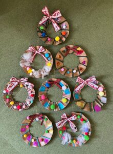 クリスマスのリース制作は、紙皿に折り紙やフェルトボール等を自由に飾り付け、個性豊かに完成させています🎄